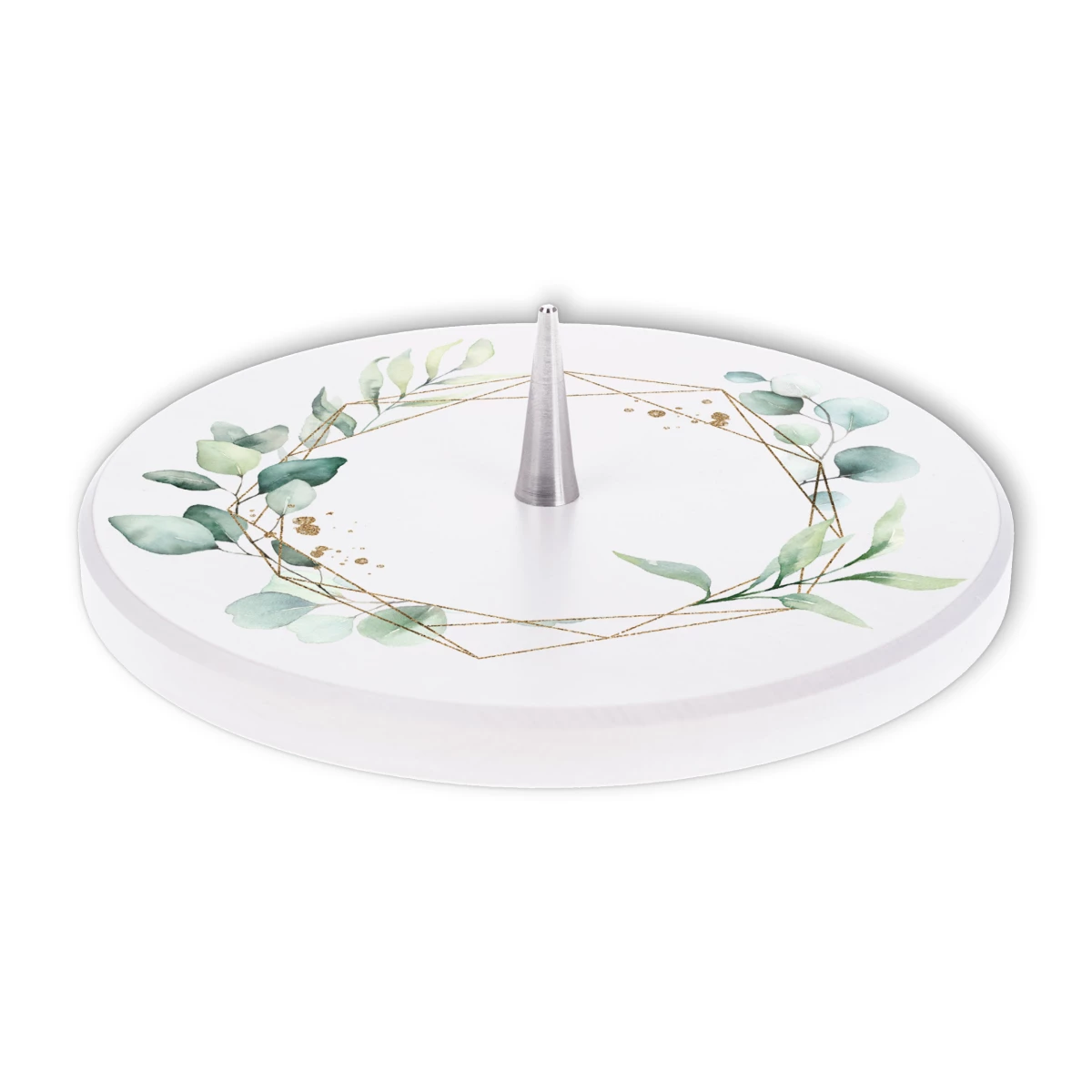 Der dekorative Kerzenhalter von Fritz Cox verbindet hochwertige Materialien mit liebevollem Design. Auf weiß lackiertem Buchenholz entfaltet sich ein zarter Eukalyptuskranz in sanften Grüntönen, veredelt mit goldenen Linien im modernen Aquarellstil.